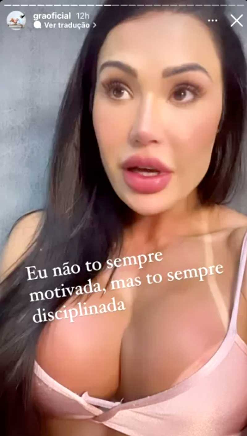 Gracyanne completou dizendo que o importante é foco e disciplina. “Mas não é assim, gente. Tem que treinar. Eu não dependo da minha motivação o tempo todo. Não dependo quase nada, porque quase nunca estou motivada. O que tenho é disciplina e compromisso. Independente de eu estar com vontade, do dia estar corrido, eu estar chateada, eu vou lá e faço. É isso que tenho pra dizer pra vocês: disciplina muito antes da motivação”.