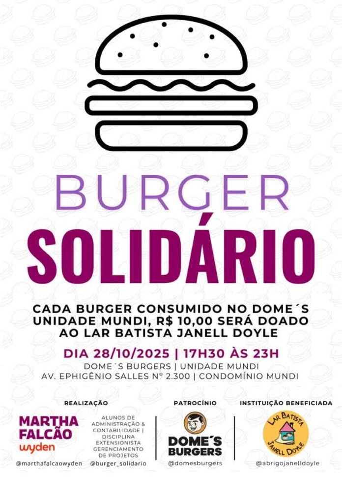 O foco da ação é o Lar Batista Janell Doyle, instituição que acolhe e cuida de crianças e adolescentes. Para cada burger vendido durante o evento, R$ 10,00 serão integralmente destinados à instituição beneficiada.