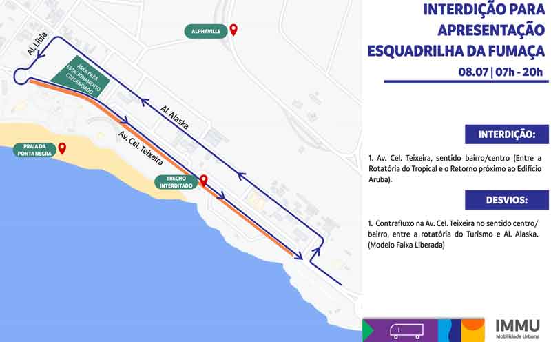 O Instituto Municipal de Mobilidade Urbana (IMMU), realizará uma interdição temporária na avenida Coronel Teixeira, na zona Oeste da cidade, no sentido bairro/Centro. O fechamento ocorrerá no próximo sábado, dia 8 de julho, no trecho entre a rotatória do Chafariz até a entrada do hotel Tropical. Essa medida será adotada no formato de faixa liberada, das 7h às 20h. O objetivo dessa interdição é proporcionar aos visitantes a oportunidade de apreciar a apresentação da esquadrilha da fumaça.