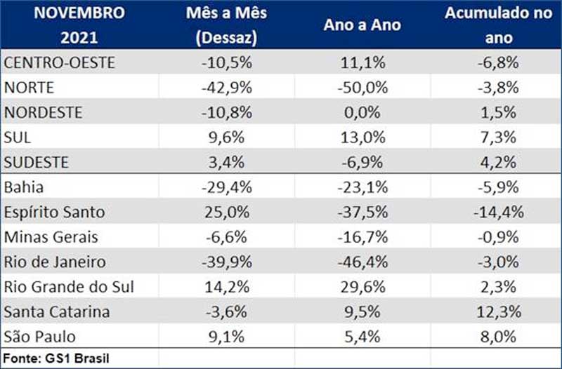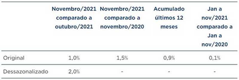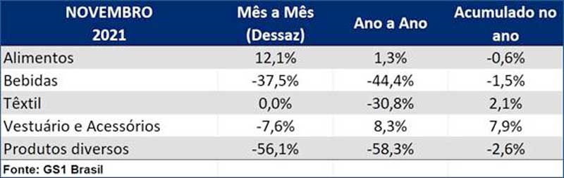 O Índice GS1 Brasil de Atividade Industrial, levantado pela Associação Brasileira de Automação-GS1 Brasil, apresentou crescimento de 2,0% para o mês de novembro na comparação com o mês anterior no dado livre de efeitos sazonais. Na comparação com novembro 2020, apresentou crescimento de 1,5%. Mas esse aumento não revela alteração do desempenho de lançamento de produtos em 2021 porque no acumulado entre janeiro e novembro, o índice se manteve estável com relação ao mesmo período do ano anterior.
