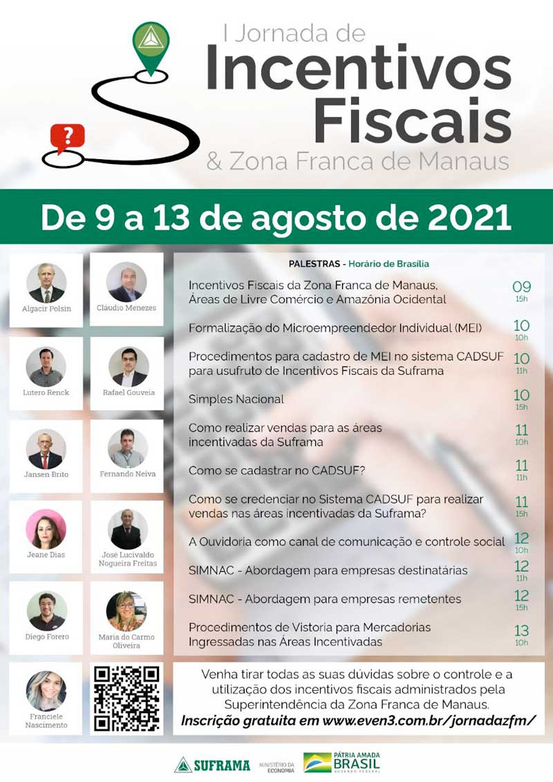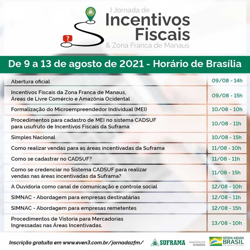 BrasilEconomia Inscrições abertas para I Jornada de Incentivos Fiscais & ZFM Já são mais de 5 mil inscritos, venha você também participar! Por Redação - 5 de agosto de 2021