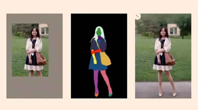 O exemplo usado na apresentação foi o de uma foto na qual as pernas de uma moça estão “cortadas” do enquadramento. A partir daí, a IA do projeto All of Me conseguiu “desfazer” o corte, adicionando as pernas da pessoa, imaginando quais sapatos ela estaria usando. Por fim, a ferramenta inseriu uma calçada aos pés da mulher e aumentou o cenário.