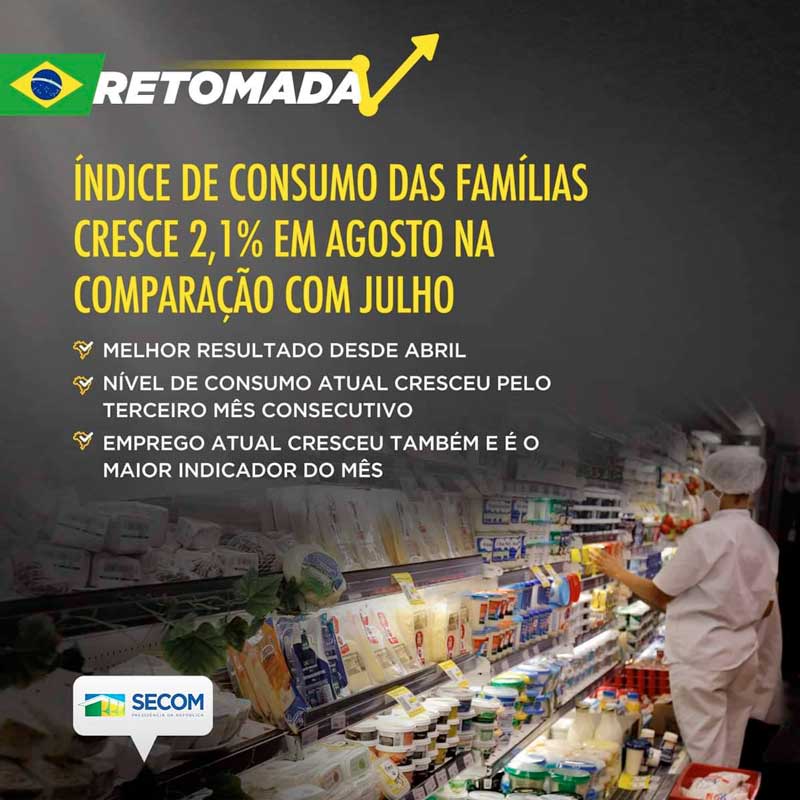 BrasilEconomia Intenção de Consumo das Famílias registrou alta pelo 3º mês consecutivo, crescendo 2,1% em agosto em comparação com julho Nível de consumo atual, renda atual e emprego atual também cresceram Por Redação - 29 de agosto de 2021 Foto: Divulgação Levantamento aponta expectativa alta das famílias com o ambiente econômico positivo