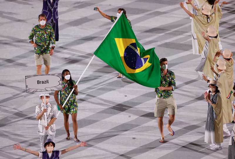 Ketleyn Quadros e Bruninho com a bandeira brasileira na abertura dos Jogos de Tóquio 2020 – Foto: Mike Blake/Reuters/direitos reservados