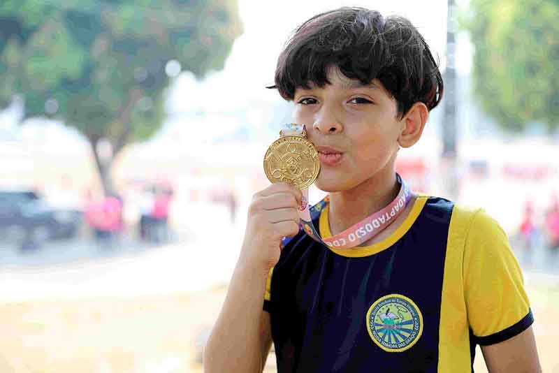 Entre os alunos observados, estava o estreante Cainã Lopes, de 10 anos. Cainã, que tem o Transtorno do Espectro Autista (TEA) e é aluno da Escola Estadual de Tempo Integral (EETI) Nossa Senhora das Graças, foi medalhista de prata na corrida dos 60 metros.