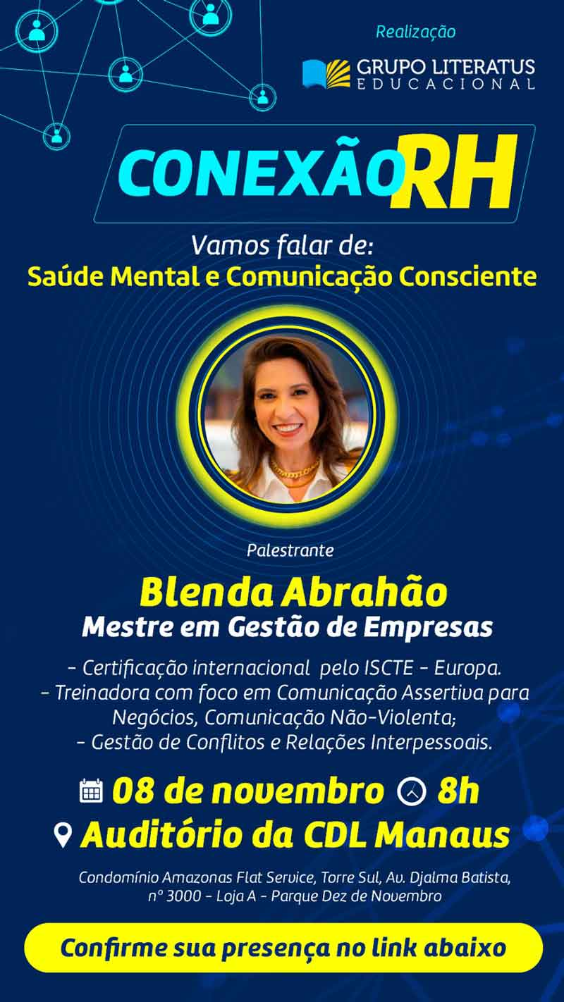 Desenvolver habilidades de comunicação consciente pode contribuir para uma melhor saúde mental, promovendo relacionamentos saudáveis, expressão emocional adequada e um diálogo interno positivo. O tema “Saúde Mental e Comunicação Consciente” será abordado nesta quarta-feira (08) em palestra da mestra em gestão de empresas, Blenda Abrahão, às 8h, no auditório do CDL Manaus, dentro do projeto Conexão RH, desenvolvido pelo Centro de Ensino Literatus.