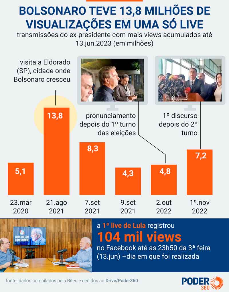 O Poder360 considerou o acumulado de views nas transmissões de Bolsonaro desde a data de publicação até a 3ª feira (13.jun).