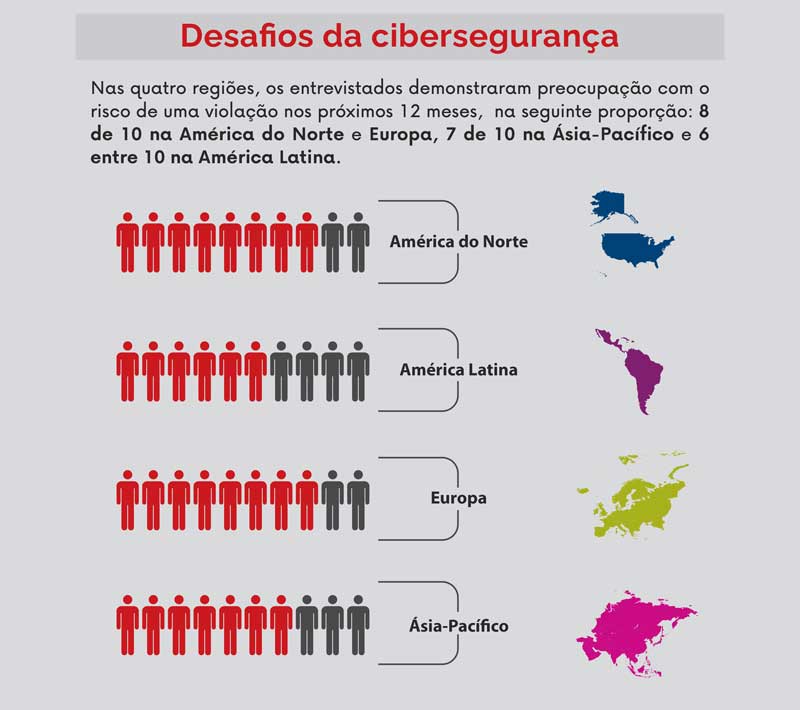 O levantamento revelou que 76% das organizações globais acreditam que serão atacadas, com sucesso, nos próximos 12 meses, sendo que 25% afirmaram que isso é “muito provável” de ocorrer, com percepção ainda maior (34%) entre as empresas norte-americanas. Foram ouvidos mais de 3.400 CISOs e gerentes de TI na América do Norte, Europa, América Latina e Ásia-Pacífico.