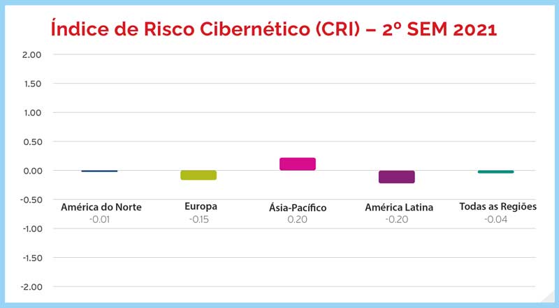 * O índice é baseado em uma escala numérica de -10 a 10, com -10 representando o maior nível de risco. Neste relatório, o CRI dos EUA ficou em -0,18 contra -0,01 para a América do Norte e -0,04 para o global, indicando um maior nível de risco. Isso foi impulsionado pelo aumento das ameaças cibernéticas nos EUA.