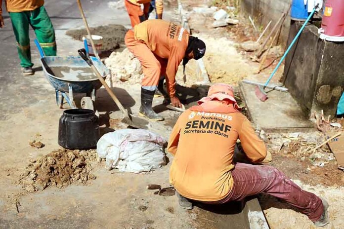 A Prefeitura de Manaus, por meio da Secretaria Municipal de Infraestrutura (Seminf), segue intensificando os trabalhos de recuperação viária e de drenagem profunda na capital. Nesta sexta-feira, 13/6, as equipes atuam de forma simultânea em duas frentes de obra no bairro Santo Agostinho, zona Oeste da cidade, com intervenções nas ruas Amauri (antiga Travessa 2) e Campina Grande.