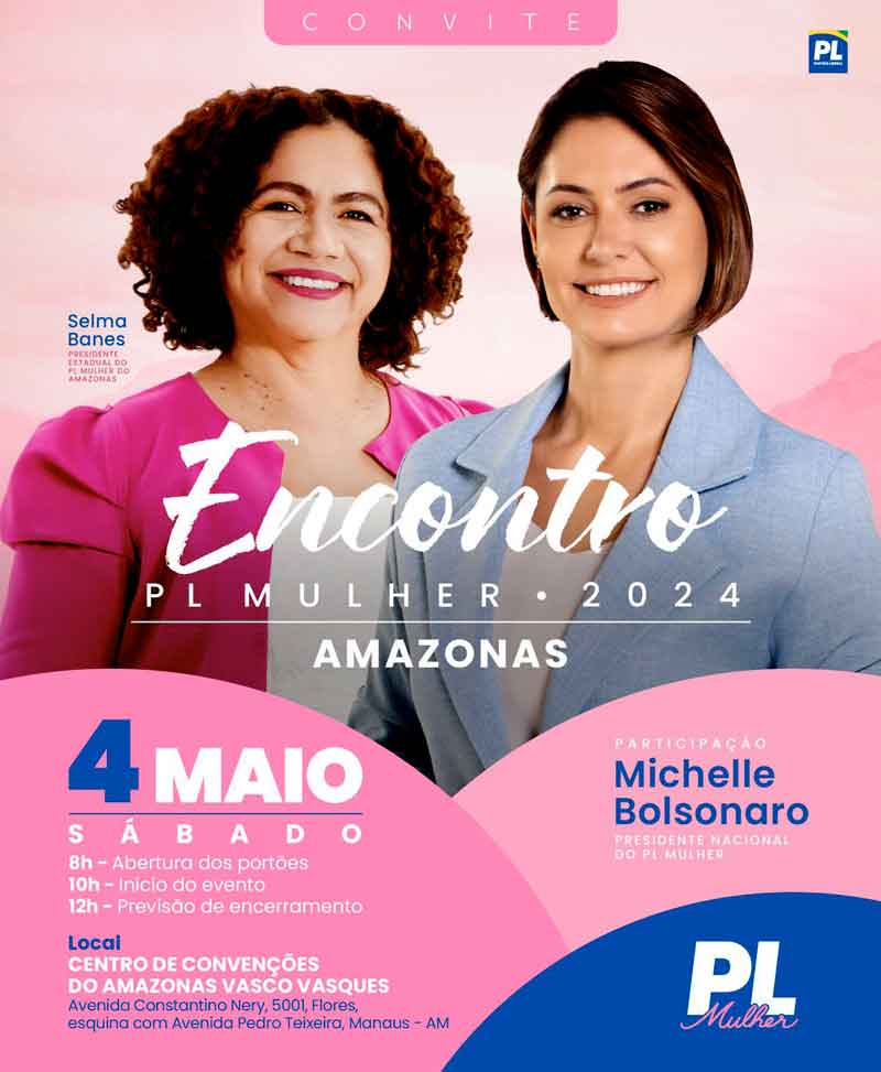 “Nossa Presidente Nacional, Michelle Bolsonaro, mais uma vez fará história em Manaus. O encontro do PL Mulher no Amazonas levantará novas vozes femininas na política através de suas palavras”, é com essa expectativa que a presidente estadual do PL Mulher, professora Selma Banes, convida as famílias amazonenses a participarem do grande encontro que acontecerá em Manaus no dia 4 de maio, a partir das 10h, no Centro de Convenções Vasco Vasques, localizado no bairro Flores, ao lado da Arena da Amazônia – os portões serão abertos às 08h da manhã.
