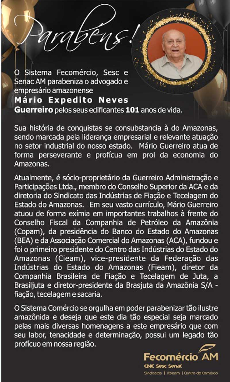 O empresário Mário Expedito Neves Guerreiro, pioneiro da industrialização das fibras na Amazônia, juta e malva, completa 101 anos. Mário Guerreiro é celebrado por ser defensor do desenvolvimento da cadeia produtiva das fibras regionais, lutando para garantir preço de venda aos produtores, distribuindo sementes para o plantio e acompanhando o processo até o produto final no mercado durante décadas.