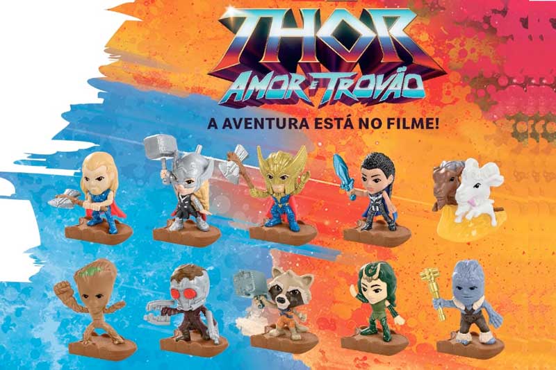 Os brinquedos inspirados em Thor: Amor e Trovão, da Marvel Studios, chegaram como um raio ao McLanche Feliz. A campanha, que está mexendo com os corações dos fãs de Marvel, leva dez miniaturas para os restaurantes do McDonald’s de todo o país para comemorar o lançamento do filme, que aconteceu no último dia 07 de julho nos cinemas brasileiros.