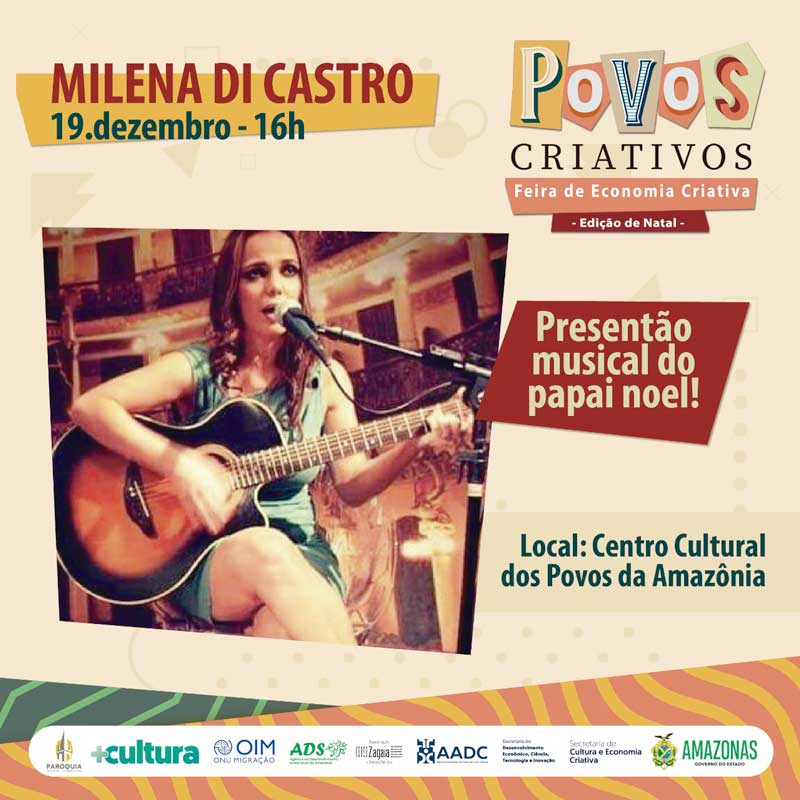Neste domingo, 19/12, às 16h, a cantora e compositora Milena di Castro fará o show de MPB “Violão e Voz – entre amigos”, no Centro Cultural Povos da Amazônia, conhecida popularmente como Bola da Suframa, na zona Sul de Manaus.