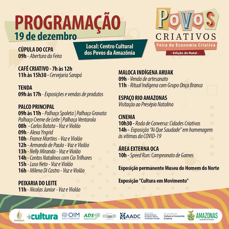 Lembrando que, desde agosto, todos os eventos do Estado do Amazonas há a obrigatoriedade de apresentação da carteira de vacinação ou certificado com o ciclo vacinal completo contra a Covid-19, no momento de acessar o Centro Cultural Povos da Amazônia, conforme estabelecido no decreto nº 44.442/2021.