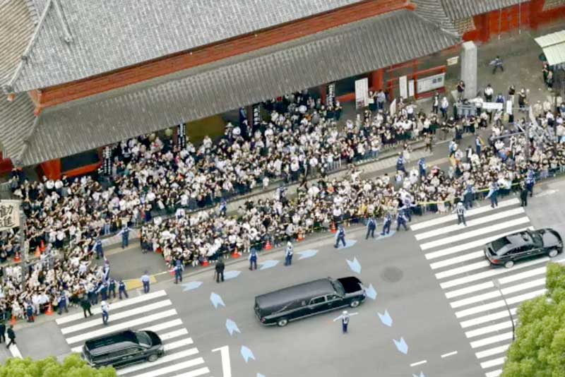 A viúva de Abe, Akie, sentou na parte da frente do carro da funerária com a lápide de seu marido com seu nome póstumo, de acordo com a tradição budista. Akie retribuiu as reverências durante o cortejo.