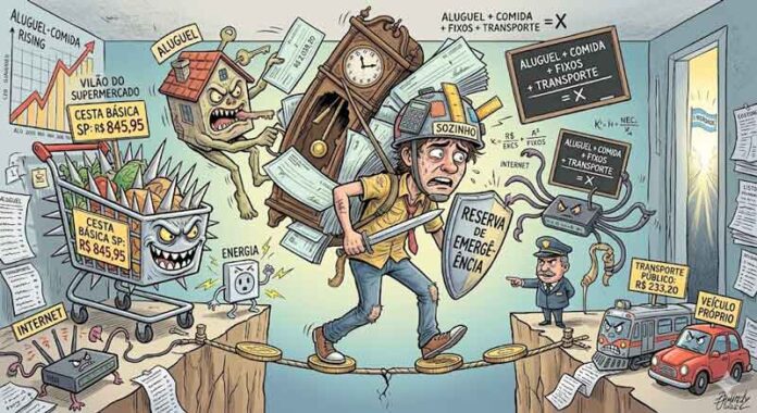 A alimentação é o segundo item de maior impacto, especialmente pela volatilidade dos preços de itens básicos. Segundo o Departamento Intersindical de Estatística e Estudos Socioeconômicos (DIEESE), a cesta básica em São Paulo encerrou o último ano custando R$ 845,95. Quando todos os custos recaem sobre uma única fonte de renda, a margem para erros desaparece.