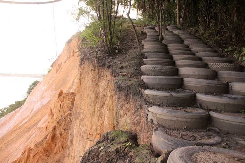 O risco de desabamento ocorre no trecho em que a Prefeitura de Manaus colocou pneus para facilitar o acesso da praia ao mirante, entre os meses de outubro e novembro de 2021. Há uma rachadura visível que corta o barranco de cima abaixo.