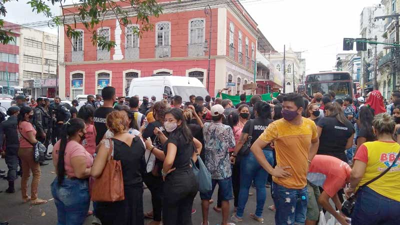 Uma multidão se reuniu em protesto, na manhã deste sábado (26), no Centro de Manaus, contra o decreto estadual que proíbe a abertura do comércio não essencial por 15 dias. A medida entrou em vigor neste sábado, e visa frear alta de casos e internações por Covid-19, segundo governo.