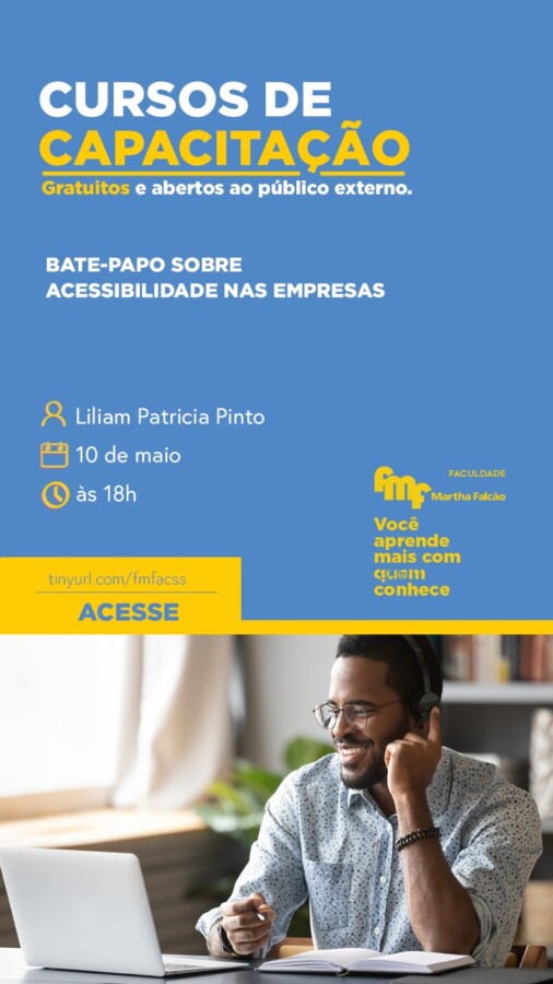 No dia 10 de maio, a partir das 18h, o público poderá tirar dúvidas do mercado de trabalho com a professora Liliam Pinto, durante o bate-papo “Acessibilidade nas Empresas”.