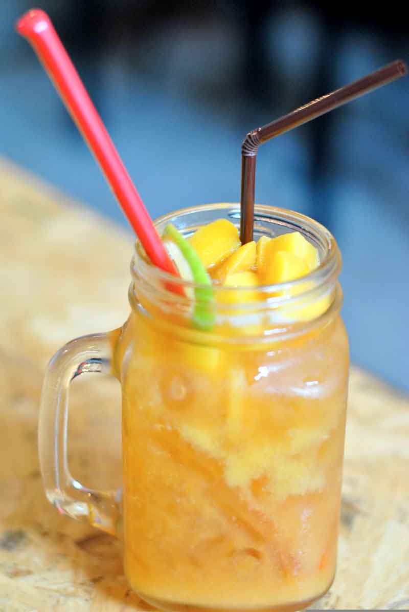 - Corte a manga em pedaços e bata no liquidificador com o suco de meio limão, açúcar ou adoçante a gosto. Caso necessário acrescente um pouco de água.