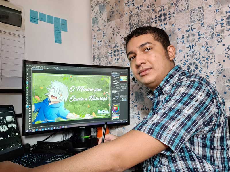 “Amo trabalhar com desenho e me expressar através da arte, por isso, me desafiei a fazer o projeto ‘O Menino que Ouvia a Natureza’, que é uma animação que utiliza a linguagem infantil para abordar como as ações humanas possuem impacto na natureza”, explica Brendo. Ele conta que a animação é uma mistura dos estilos Mangá e Cartoon. “Gosto das animações japonesas e venho estudando e treinando meu estilo de desenho com base no trabalho deles”, revela o artista.