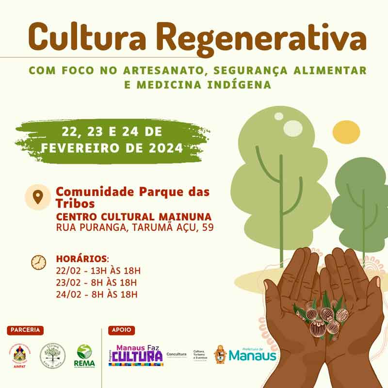 Nos dias 22, 23 e 24 de fevereiro, o Centro Cultural Mainuma, no Parque das Tribos, em Manaus, se tornará o epicentro de uma iniciativa pioneira: a Oficina Cultura Regenerativa, com foco em artesanato, segurança alimentar e medicina indígena, que surge como preparação para a implementação de um sistema de plantio na Reserva Nascente das Tribos. Os horários serão das 13h às 18h na quinta-feira e das 8h às 18h na sexta-feira e no sábado.