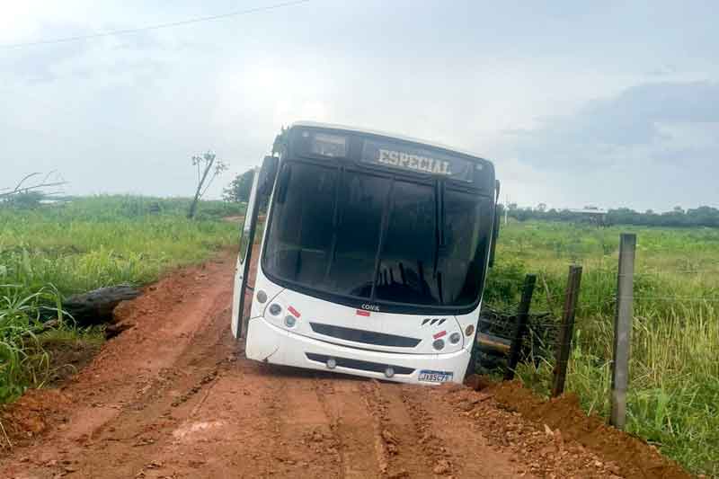 • Ônibus com pneus carecas e se desfazendo em vias de barro.