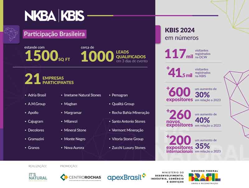 Apenas a KBIS, nos três dias de evento, recebeu mais 41.500 visitantes, a feira registrou aumento significativo no número de expositores em relação ao ano anterior. Foram mais de 670 expositores, representando um aumento de 30%, e mais de 260 novos expositores, um aumento de 40%. O aumento na participação internacional também é digno de nota, com mais de 200 expositores internacionais, representando um aumento de 35% em relação ao ano anterior. Esses números refletem a relevância crescente da KBIS como um evento global e a decisão acertada do setor de rochas brasileiro em firmar presença no evento.
