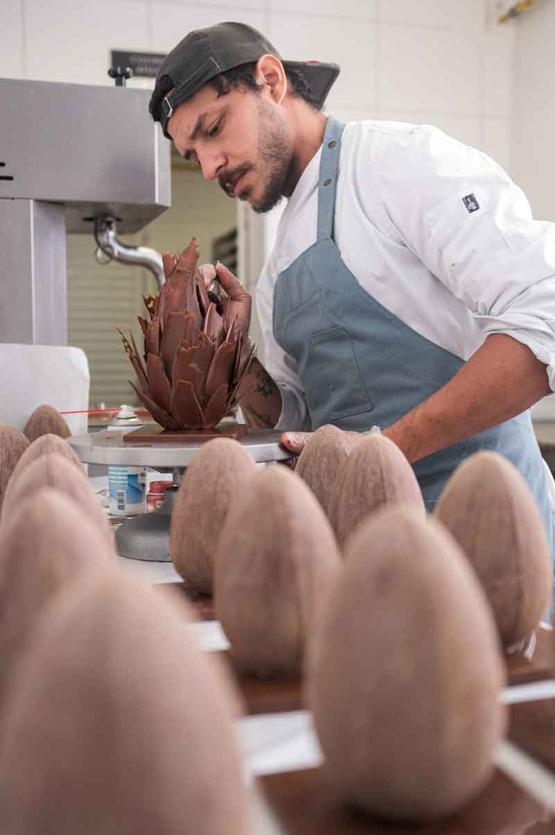 Para a Páscoa 2025, o chef Lucas Pyetro trouxe inspirações dos contos de fadas. Ele desenvolveu mais de 100 itens entre esculturas e ovos de chocolate.