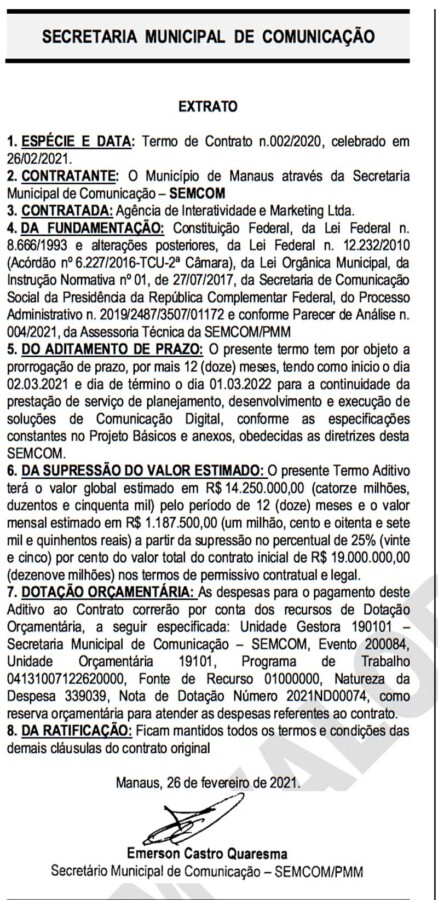 - No início de abril deste ano o prefeito David Almeida (Avante) renovou contrato, da ordem de R$ 14 milhões, e não R$ 19 milhões, com a Agência de Interatividade e Marketing Ltda (Imarketing), pertencente a Durango Duarte.
