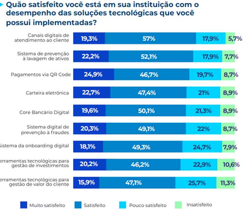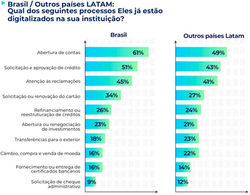 Algumas soluções tecnológicas, como prevenção a fraudes e sistemas de onboarding digital, têm maior prioridade no Brasil, assim como os níveis de satisfação com essas ferramentas, a digitalização da abertura de contas, processos de solicitação de crédito e renovações de cartões, em comparação com o restante dos países da América Latina.