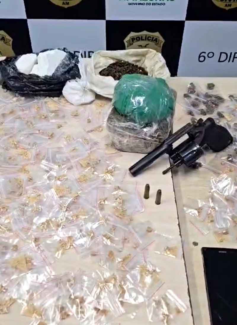 Foram apreendidas quantias significativas de oxi, maconha e cocaína, além de uma arma de fogo, balanças de precisão e 12 aparelhos celulares.