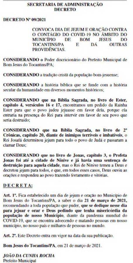 “Considerando que no livro de Jonas, capítulo 3, o Profeta Jonas foi até a cidade de Nínive e já havia uma sentença de destruição para aquela cidade, mas o Rei de Nínive temeu a Deus e decretou jejum para todos, e que, em todos esses casos, Deus ouviu as orações e respondeu ao povo trazendo livramento e vitórias”, também pontua o texto do decreto municipal.