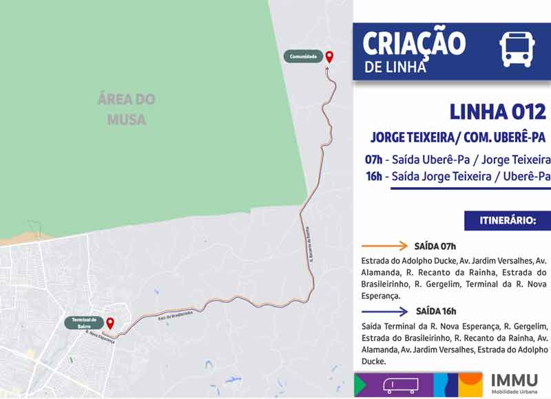 A partir desta quarta-feira, 6/12, a Prefeitura de Manaus, por meio do Instituto Municipal de Mobilidade Urbana (IMMU), vai criar a linha 012 – Jorge Teixeira / Comunidade Uberê-Pa para atender os usuários de transporte do ramal Uberê, localizado próximo Reserva Adolpho Ducke, na zona Leste da cidade.