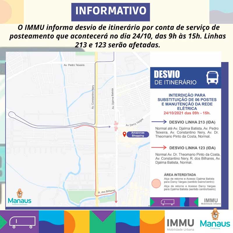 Neste domingo, 24/10, a Prefeitura de Manaus, por meio do Instituto Municipal de Mobilidade Urbana (IMMU), fará desvios de trânsito e de linhas de ônibus nas duas alças de retorno da passagem de nível nas avenidas Djalma Batista e Darcy Vargas, na zona Centro-Sul da capital. As interdições, entre 9h e 15h, ocorrerão para instalação de postes de energia na região.