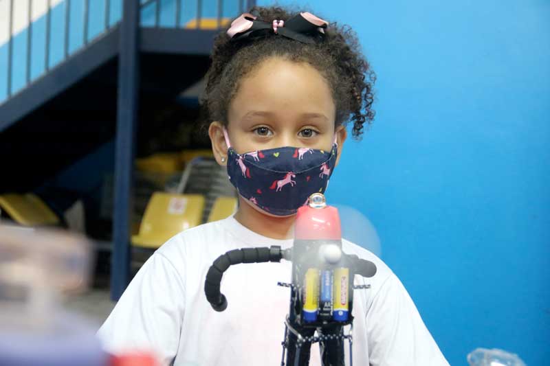 “Usei caixa de sapato, papelão, escova de dente, esponja e lata de leite. Essa máquina ensina como o lixo deve ser reciclado e como deve combater os gases poluentes”, explicou a aluna.