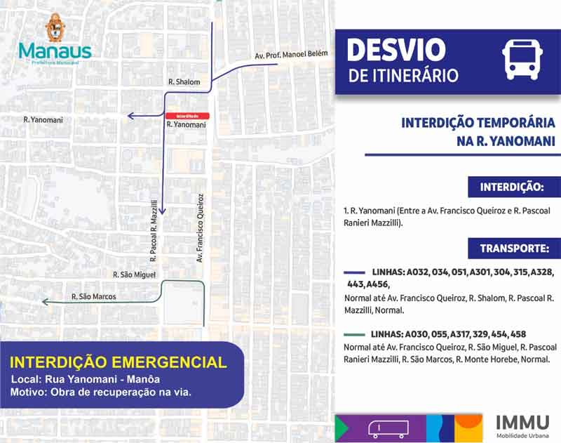 A Prefeitura de Manaus, por meio do Instituto Municipal de Mobilidade Urbana (IMMU), fez uma interdição emergencial em um trecho da rua Yanomami, no conjunto Manoa, bairro Cidade Nova, na zona Norte, para a realização de drenagem e implantação de canaletas no entorno da via. Cerca de 15 linhas de ônibus tiveram o itinerário alterado. Os trabalhos estão sendo realizados pela Secretaria Municipal de Infraestrutura (Seminf) e têm previsão de duração de até 20 dias.