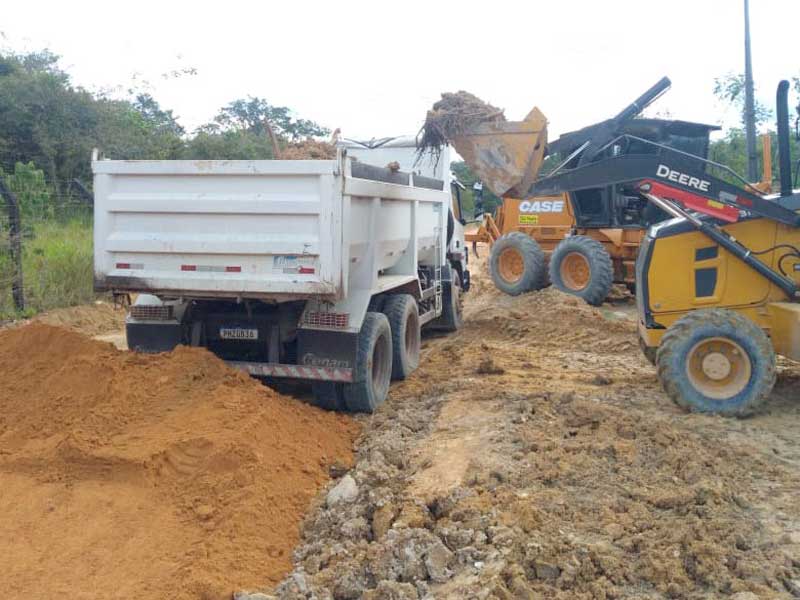 No local, servidores da Seminf trabalham com máquinas, composta por retroescavadeira, motoniveladora, rolo compactador, rolo chapa, caçambas e espargidor na execução da substituição da base da via, para, posteriormente, receber a fresa e finalizar com a pavimentação asfáltica em todo o percurso do ramal.