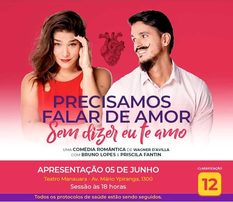 Os atores Bruno Lopes e Priscila Fantin se apresentam no Teatro Manauara com a comédia ‘Precisamos falar de amor sem dizer eu te amo’, no domingo, 5 de junho, às 18h, no Teatro Manauara.
