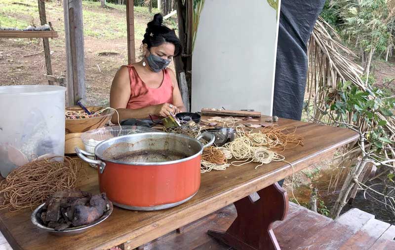 “Eu dou cursos e orientação para pessoas que estão iniciando e nos grupos que eu passava eram sempre as mesmas cores. Isso me incomodava, porque eu olhava e via que era praticamente uma cópia dos materiais vendidos no Mercadão [Mercado Adolpho Lisboa, em Manaus]. E um dia eu olhei para uma colega minha e disse: vamos mudar? Foi então que eu comecei a pesquisar e lembrei que meu pai, quando eu era mais nova, usava a malhadeira para pescar, e pintava a rede com folha de crajirú para atrair os peixes”, contou.