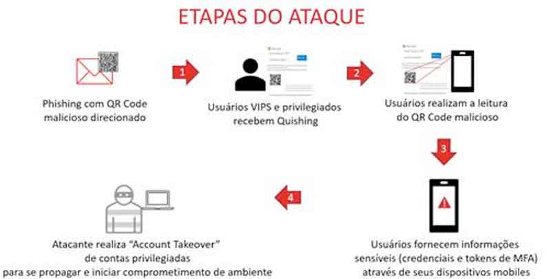 Acima, o fluxo de ataque de Quishing com cada uma das etapas realizadas pelos cibercriminosos
