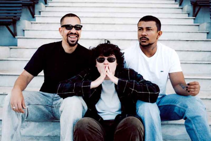 Os artistas Xamã, Ana Frango Elétrico e Victor Xamã, responsáveis pela trilha sonora "Federais" na série "Os Donos do Jogo" da Netflix – Foto: Divulgação