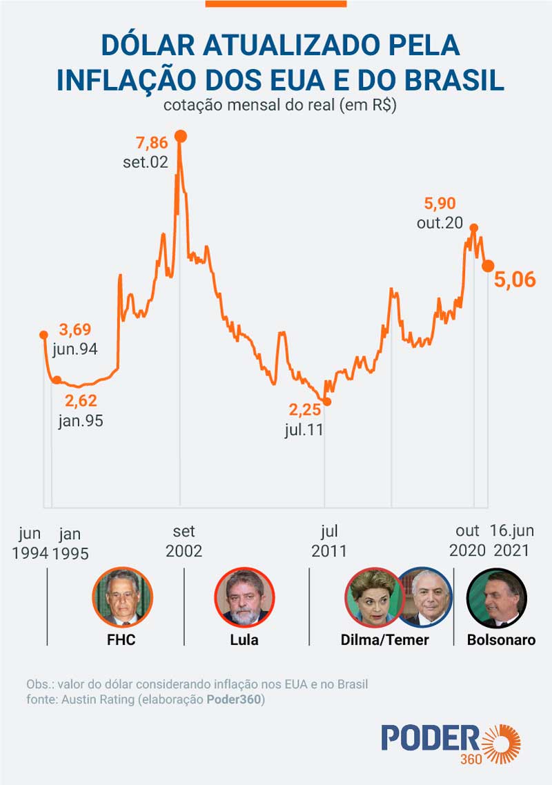 Quando o Plano Real foi lançado, em junho de 1994, o dólar era cotado a R$ 1. Quando se faz um cálculo considerando as taxas de inflação dos EUA e Brasil nesse período, aquele R$ 1 de 1994 seria R$ 3,69 a preços de hoje. Nesse gráfico a seguir, que considera a os índices de preços dos 2 países, o pico foi em setembro de 2002, durante as eleições que levariam Lula à Presidência: R$ 7,86.