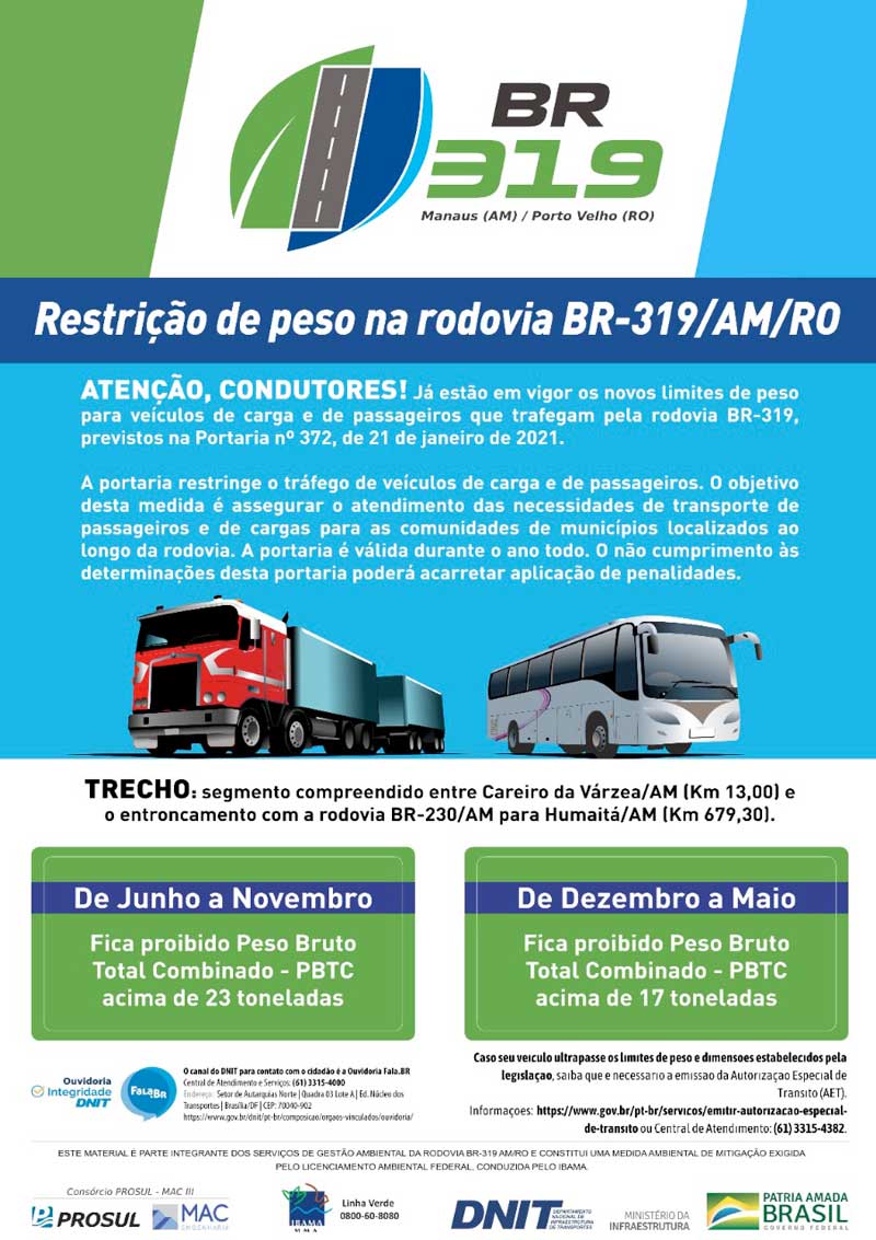 Considerando as condições de capacidade de suporte da via, a nova portaria tem o objetivo de assegurar o atendimento às necessidades de transportes de passageiros e de cargas para as comunidades de municípios localizados ao longo da rodovia.