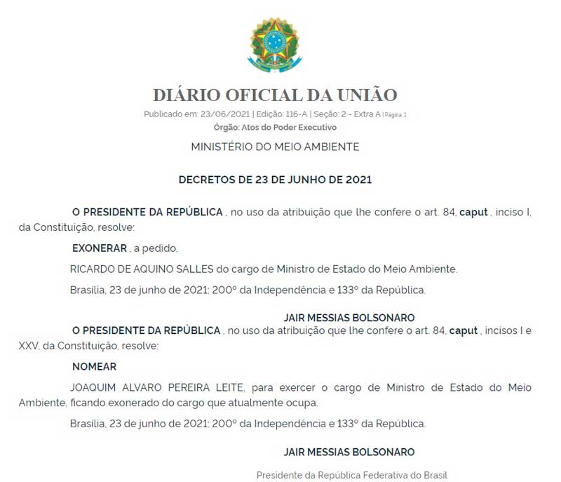 No lugar de Salles, o presidente nomeou Joaquim Álvaro Pereira Leite, que até então ocupava o cargo de secretário da Amazônia e Serviços Ambientais do ministério.