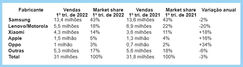 Os indicadores mostram as empresas que mais se destacaram no bloco. Segundo o relatório, na comparação anual, a Samsung manteve a sua participação de mercado de 43%. Ainda assim, a companhia teve uma queda de 2% em 2022, depois que vendeu 13,4 milhões de celulares. No 1º trimestre de 2021, foram 13,6 milhões de unidades.