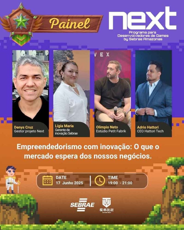 Como destaque do lançamento, o painel “Empreendedorismo com Inovação: o que o mercado espera dos nossos negócios” reunirá dois nomes de peso do ecossistema local: Denys Cruz, gestor do projeto Next do Sebrae-AM; Lígia Maria, gerente de Inovação do Sebrae-AM; Olimpio Neto, fundador do estúdio Petit Fabrik; e Adrio Hattori, CEO da Hattori Tech. Eles irão compartilhar experiências e tendências sobre o que investidores e o mercado buscam nos projetos criativos e tecnológicos.