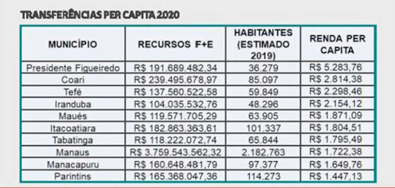 Conforme o levantamento, dos 62 municípios do Amazonas, Presidente Figueiredo lidera em repasse por habitante. O município recebeu R$ 191,6 milhões em repasses dos governos federal e estadual em 2020. “O primo rico da história é Presidente Figueiredo que em 2020 recebeu R$ 191 milhões de recursos e quando você divide pelos habitantes (36.279) chega a uma renda per capita de R$ 5.283,76.