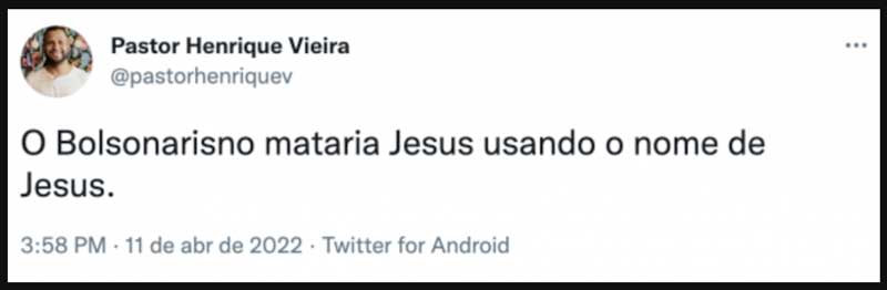O autointitulado “pastor” Henrique Vieira, cuja imagem tem sido promovida pela grande imprensa e por artistas da Globo e cantores de funk, usou o Twitter para afirmar que o “bolsonarismo mataria Jesus usando o nome de Jesus”.